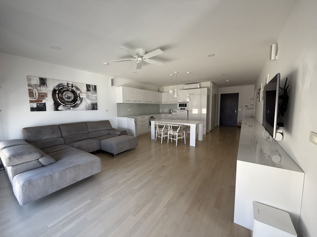 V novi soseski Belle Vie Tivoli oddamo nadstandardno opremljeno stanovanje. Stanovanje ima večjo vgrajeno kuhinjo z vsemi gospodinjskimi aparati in belo tehniko. Prostor je odprt v jedilnico in v nadaljevanju v dnevno sobo, kjer se lahko razvajate na razkošni sedežni garnituri. V stanovanju je tudi TV. Stanovanje ima dve spalnici z izhodom na veliko teraso. Ima tudi dve kopalnici, ena je s kadjo in v drugi je vgrajen tuš. Tudi kopalnici sta kompletno opremljeni, vključno s pralnim strojem. Na hodniku v spalnem delu stanovanja so po celotni dolžini vgrajene prostorne omare. Vsa oprema, materiali in izvedba je nadstandardna. Stanovanje ima čudovito 20,5 m2 veliko teraso, ki je dostopna tako iz dnevne sobe, kot iz spalnic. Pripada mu tudi 16,10 m2 velika klet in dve parkirni mesti v garaži objekta.